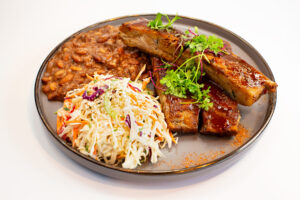 Meaty spare ribs with coleslaw and fried beans puree
